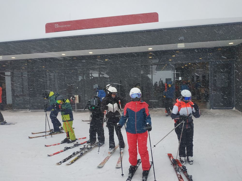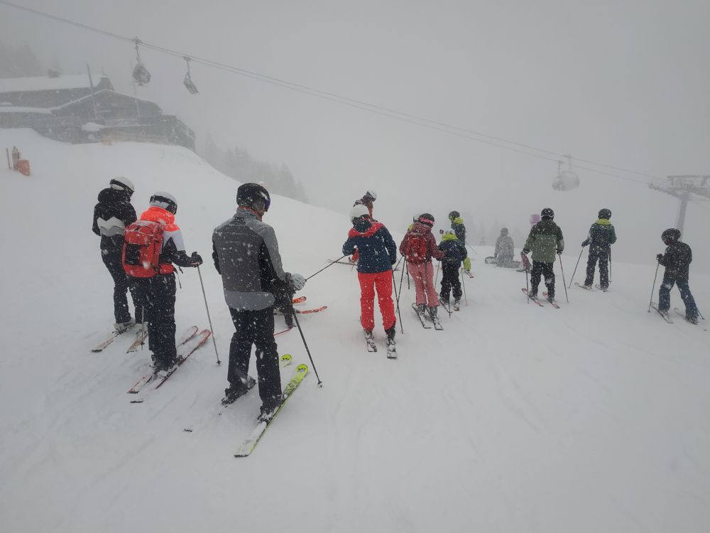 Die Wettervorhersage sollte sich bewahrheiten: Neuschnee, eingeschränkte Sicht, Wind und teilweise schlecht präparierte Pisten machten das Skifahren anspruchsvoll. Dennoch waren alle mit viel Einsatz dabei. Besonders schön war, dass fünf Familien mit Kindern den ganzen Tag gemeinsam unterwegs waren – auch wenn der Nachwuchs zwischendurch Geduld beweisen musste, da nicht alle Lifte in Betrieb waren.